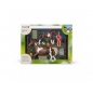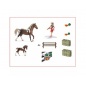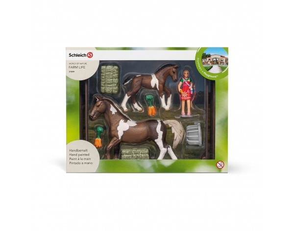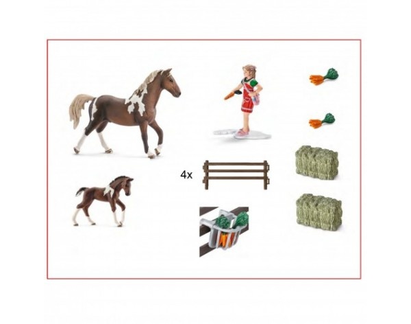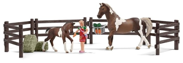 В набор входят жеребец с жеребенком, тюки с сеном и соломой, кормушка, пучки морковки, а также фигурка девочки и 6 секций для загона. Обратите внимание, как тщательно проработана каждая мелочь. Отлично видно отдельную соломинку в тюке и черточки на плоде морковки. Все это стало возможным благодаря тому, что каждая деталь набора делается вручную. Игрушки сделаны из качественной безвредной пластмассы.