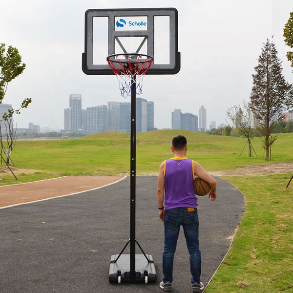 Мобильная стойка Scholle S003-21 с диаметром баскетбольного кольца 45 см. (18’) и размером щита 110 x 75 см. Бесступенчатая регулировка высоты кольца от 1,50 до 3,05 м. Предназначена для игры в баскетбол (стритбол) как в помещениях, так и на улице. Имеет устойчивую конструкцию и усиленное металлическое кольцо для активной игры. Емкость основания заполняется 65 кг воды или песка. Встроенные в основание транспортировочные колеса облегчают транспортировку.