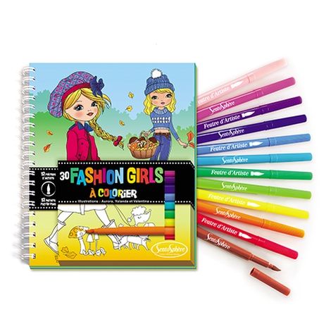 В новой раскраске Модные девочки ребенок найдет книгу с картинками из 32 листов, а также 12 разноцветных фломастеров, с помощью которых малыш будет раскрашивать необычные картинки с красивыми стильными девочками.
