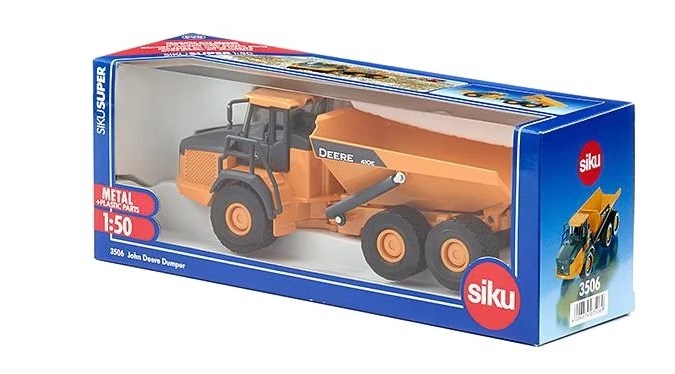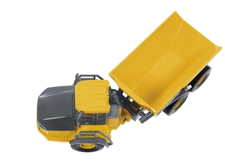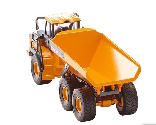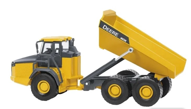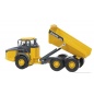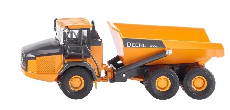 Самосвал John Deere станет замечательным подарком для любителей и коллекционеров моделек специальной техники. Кузов самосвала соединен с прицепом прочным шарнирным соединением. Кабина и кузов выполнены из металла. Кузов опрокидывается для разгрузки материалов. Крупные колеса выполнены из прорезиненного материала, крутятся, модельку можно катать.