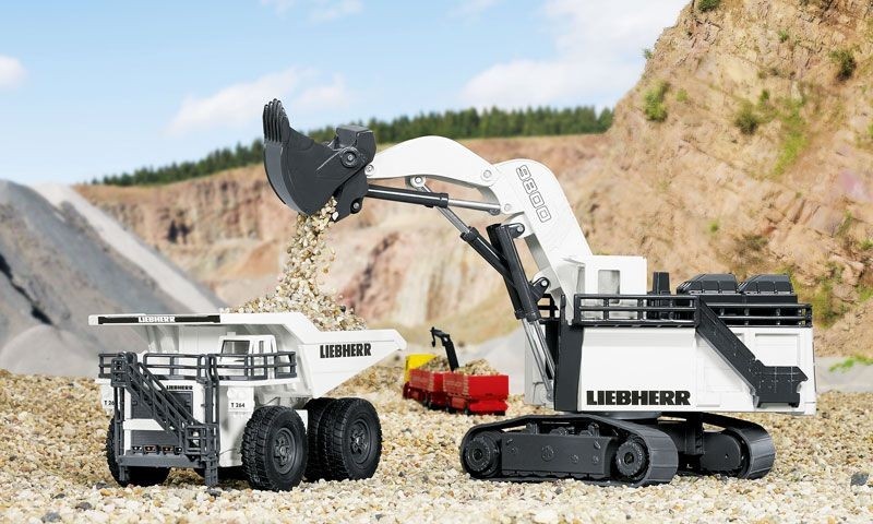 Экскаватор R9800 от Liebherr является одним из крупнейших и самых мощных экскаваторов в мире. Две широкие гусеничные цепи перемещают модель с прочными металлическими частями. Огромный ковш на подвижном основании загружает горный самосвал в кратчайшие сроки.