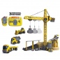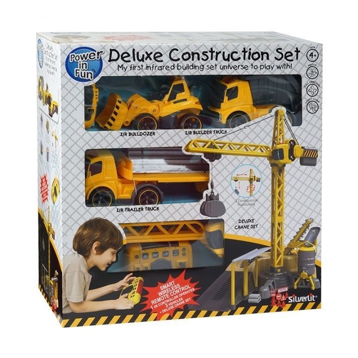 Большой набор включает строительную и погрузочную площадку с краном, самосвал, бульдозер, тягач и различные аксессуары (бочка, строительные и дорожные знаки, стройматериал). Вся техника управляется дистанционно, радиус действия пультов равен пяти метрам. Одновременно можно управлять сразу несколькими машинками, благодаря тому, что в наборе два пульта.