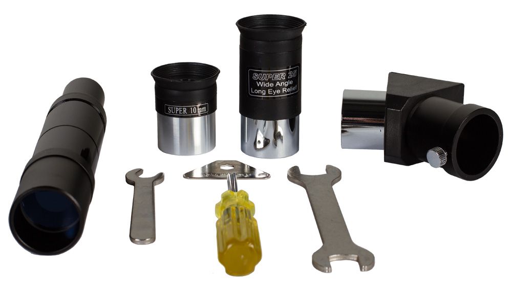 Реечный фокусер позволяет точно настроить резкость изображения. Телескоп комплектуется двумя окулярами 25 мм (36x) и 10 мм (90x). Первый используется для обзорных наблюдений, а второй оптимален для детального изучения астрономических объектов.