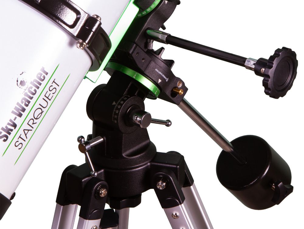 Экваториальная монтировка StarQuest EQ1 управляется вручную и имеет плавный ход. Ее прецизионные шестерни с червячными передачами снабжены 122 зубцами, ручки тонких движений позволяют точно и быстро регулировать положение оптической трубы по обеим осям. Крепление к монтировке – классический «ласточкин хвост» стандарта Vixen. Монтировка устанавливается на алюминиевую треногу, высоту которой можно регулировать. Есть лоток для аксессуаров.
