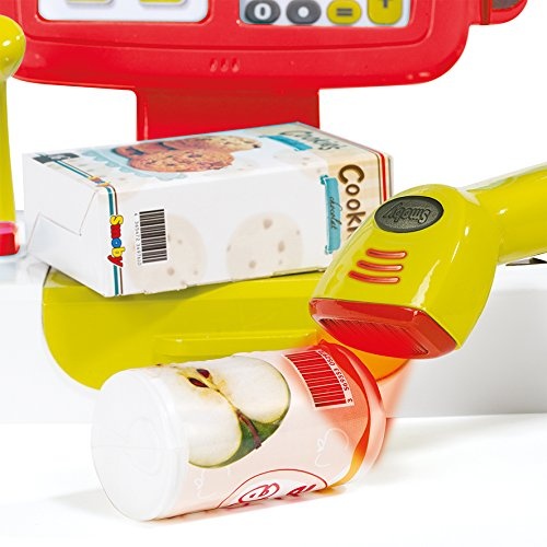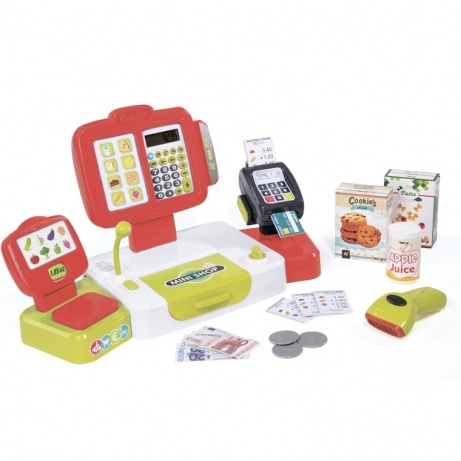 Игровой набор «Электронная касса с аксессуарами» расширит границы сюжетно-ролевой игры в магазин. Благодаря комплекту из 27 предметов дети смогут организовать кассовую зону с весами, кассой-калькулятором, терминалом для расчёта за товар банковской картой, сканером, считывающим товар и необходимой денежной валютой, картой и имитацией товаров.