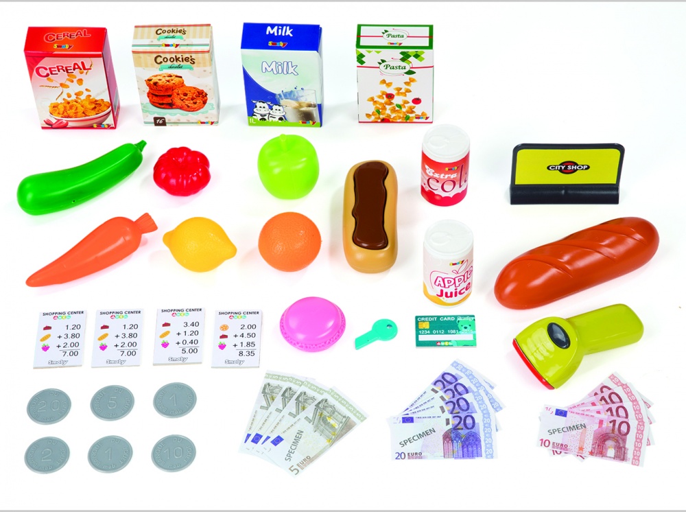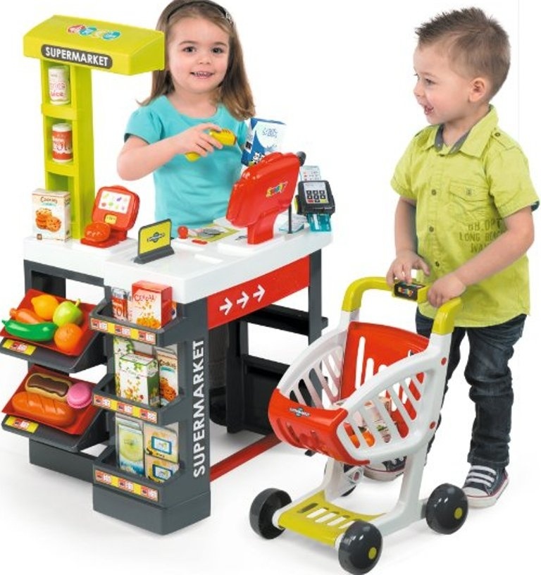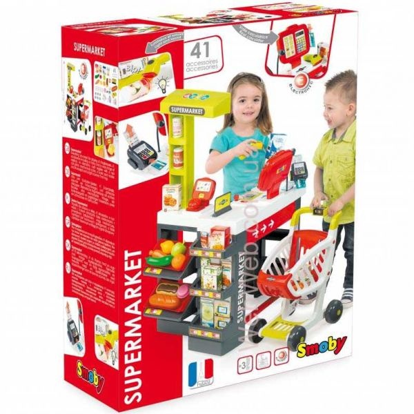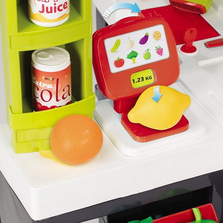 Игровой набор "Супермаркет" состоит из магазинной стойки, продуктовой тележки на колесиках и разных аксессуаров. Стойка оснащена множеством полок, на которых маленький продавец сможет разместить игрушечный продукты и другой товар. В комплекте имеются функциональные игрушки со световыми и звуковыми эффектами, такие как сканер, аппарат для приема кредиток и выдачи чека, касса.