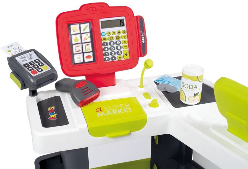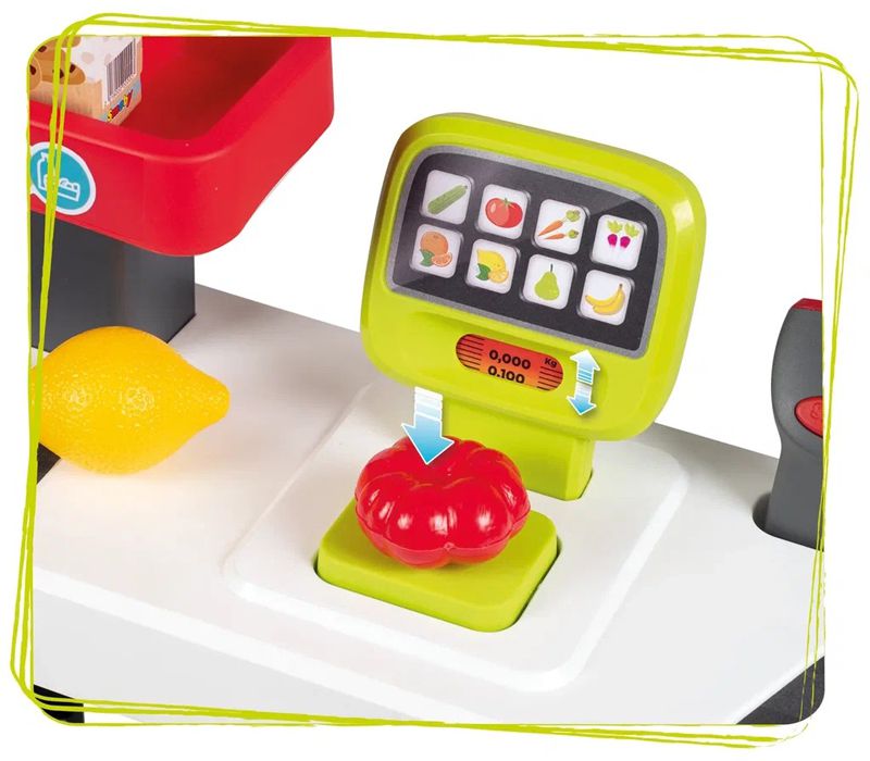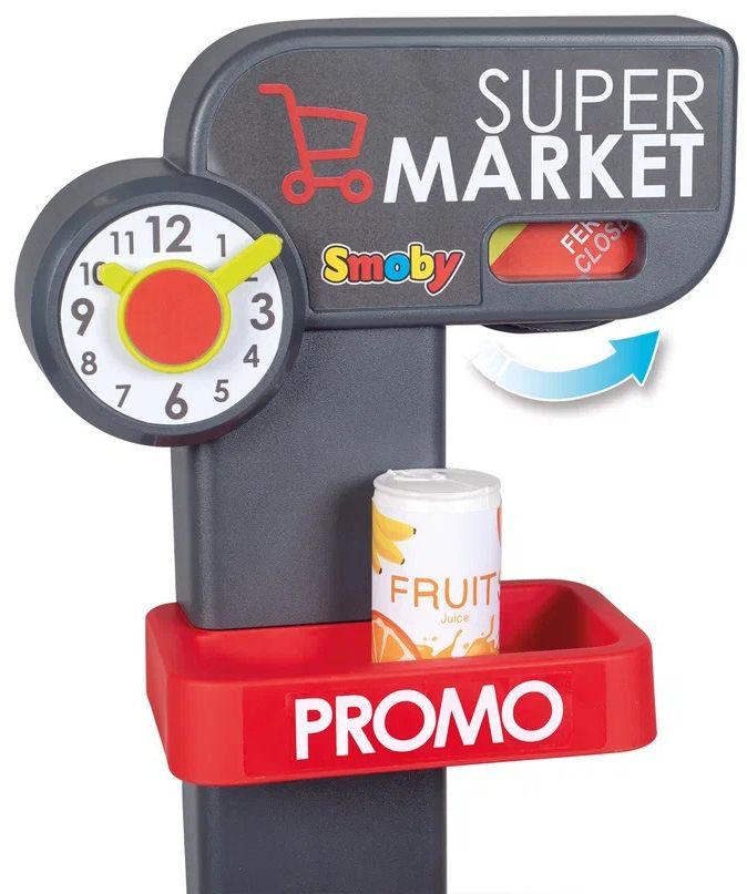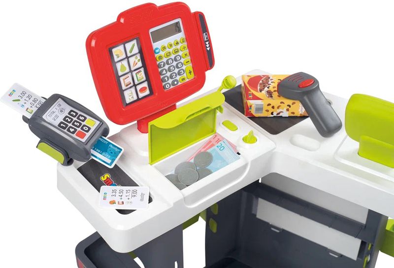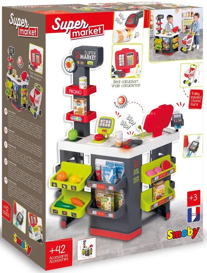 Продуктовый супермаркет с тележкой от французского производителя Smoby - отличный подарок для детей от 3-х лет. В магазине есть кассовый аппарат с функциональным калькулятором, весы для взвешивания товаров, платежный терминал, часы, микрофон, и сканер товаров, который загорается и издает звуки при нажатии кнопки. В магазине можно расплачиваться кредитной картой через платежный терминал, из которого покупатель получает чек. Монеты и банкноты размещаются в отсеке на кассе. При совершении покупок дети складывают товары в тележку на колесиках, и относят на кассу. В совокупности в детском магазине есть 42 аксессуара, включая коробки с едой, фруктами, овощами, пирожными, напитками, монетами и банкнотами, так что дети получат по-настоящему реалистичные впечатления от игры.