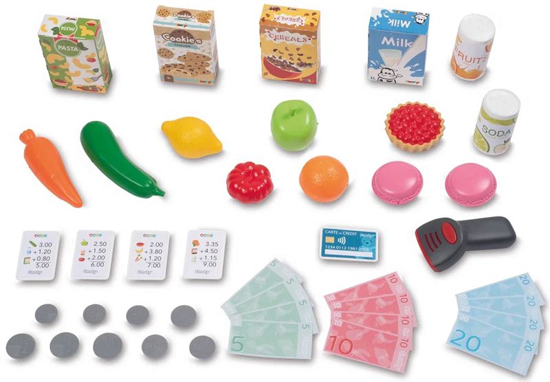 Комплект из 42 принадлежностей - касса, зона фруктов и овощей, небольшие секции, взвешивание, весы, 4 коробки (макароны, печенье, крупы, молоко), 6 фруктов и овощей, 1 пирог, 2 макароны, 2 банки, 1 электронный штрих-код сканер со звуком и светом, 1 кредитная карта, 4 квитанции, 9 монет и 12 купюр, 1 тележка в комплекте.