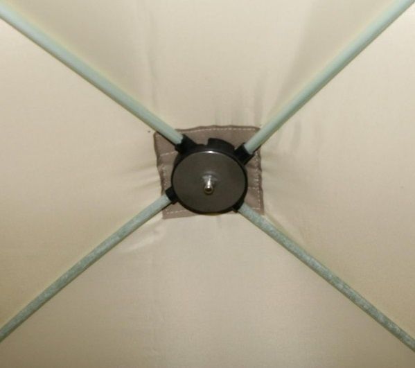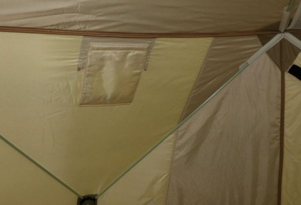Стены палатки изготовлены из двух слоев водоотталкивающей ткани Oxford 240D с полиуретановым покрытием, между которыми находится толстый слой утеплителя, синтепона плотностью 150г/м2. Светлые ткани, используемые на внутренней части стен, обеспечивают отличную видимость внутри палатки, даже без открытия шторок на окнах. Каркас изготовлен из надежных пластиковых хабов и стеклокомпозитных материалов собственного производства, обладающих повышенной прочностью и жесткостью, благодаря чему палатке не страшен самый сильный ветер.