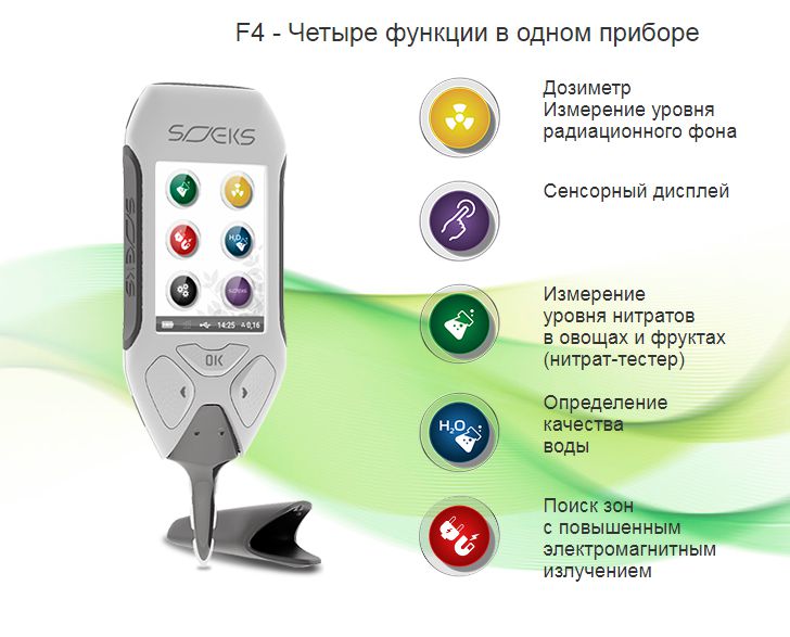 Дозиметр Эковизор F4 поможет проверить радиационный фон продуктов питания, воды и любых предметов. После включения Эковизор Соэкс непрерывно измеряет радиацию и контролирует накопленную дозу. Если накопленная за месяц доза радиации превысит норму, Эковизор F4 предупредит Вас об опасности для здоровья.