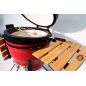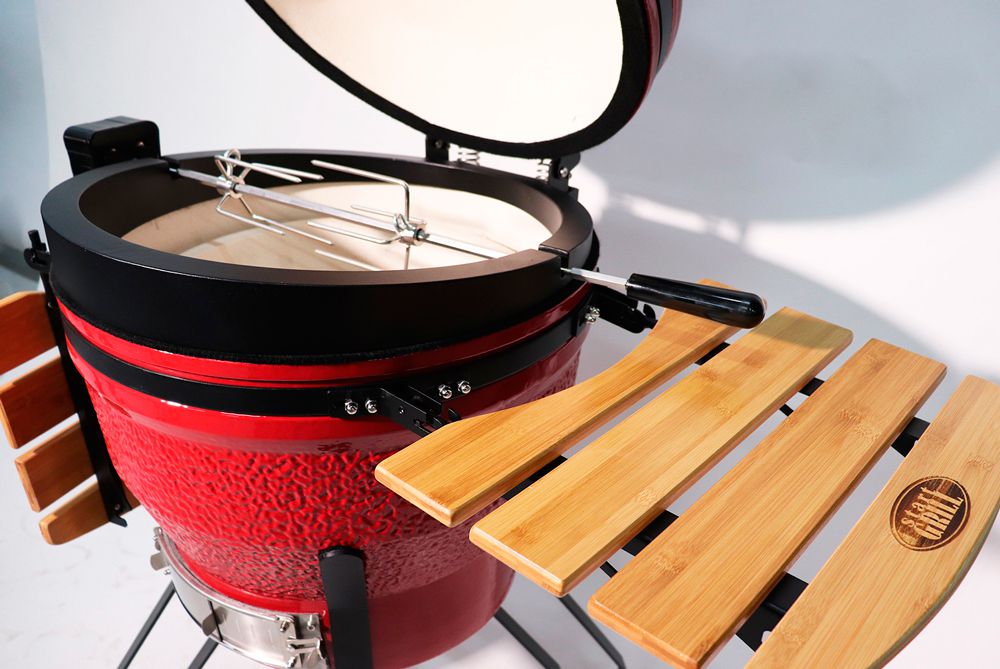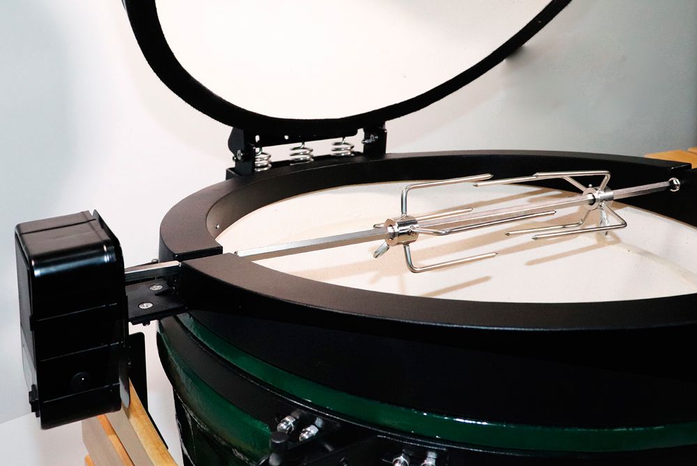 Благодаря мощному мотору вертел способен проворачивать большие куски мяса и обеспечивать равномерное приготовление. Основание вертела имеет специальную форму, которая позволяет плотно закрывать крышку керамического гриля. Установка вертела не требует каких-либо специальных навыков и приспособлений. Легко очищается и имеет антипригарное покрытие. Мотор на батарейках не требует линий электропередач и может использоваться в любом удобном месте. А технология изготовления мотора позволяет экономично использовать ресурс элементов питания. Данный вертел подходит для керамических грилей диаметром 21 или 22 дюйма.