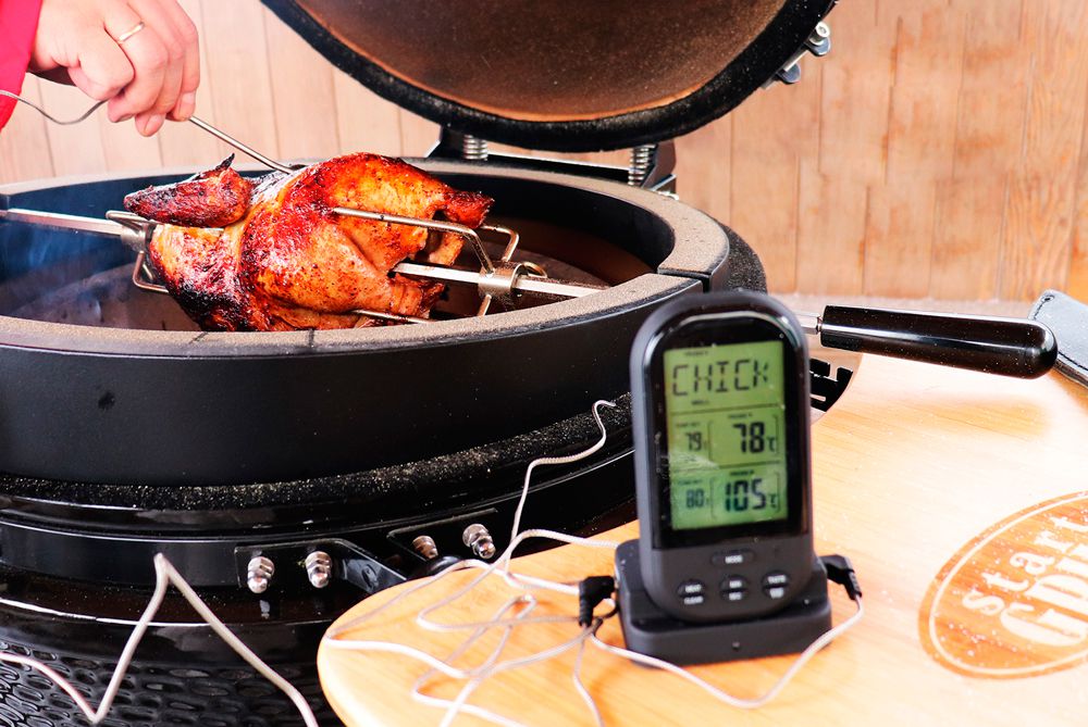 Благодаря мощному мотору вертел способен проворачивать большие куски мяса и обеспечивать равномерное приготовление. Основание вертела имеет специальную форму, которая позволяет плотно закрывать крышку керамического гриля. Установка вертела не требует каких-либо специальных навыков и приспособлений. Легко очищается и имеет антипригарное покрытие. Мотор на батарейках не требует линий электропередач и может использоваться в любом удобном месте. А технология изготовления мотора позволяет экономично использовать ресурс элементов питания. Данный вертел подходит для керамических грилей диаметром 23 или 24 дюйма.