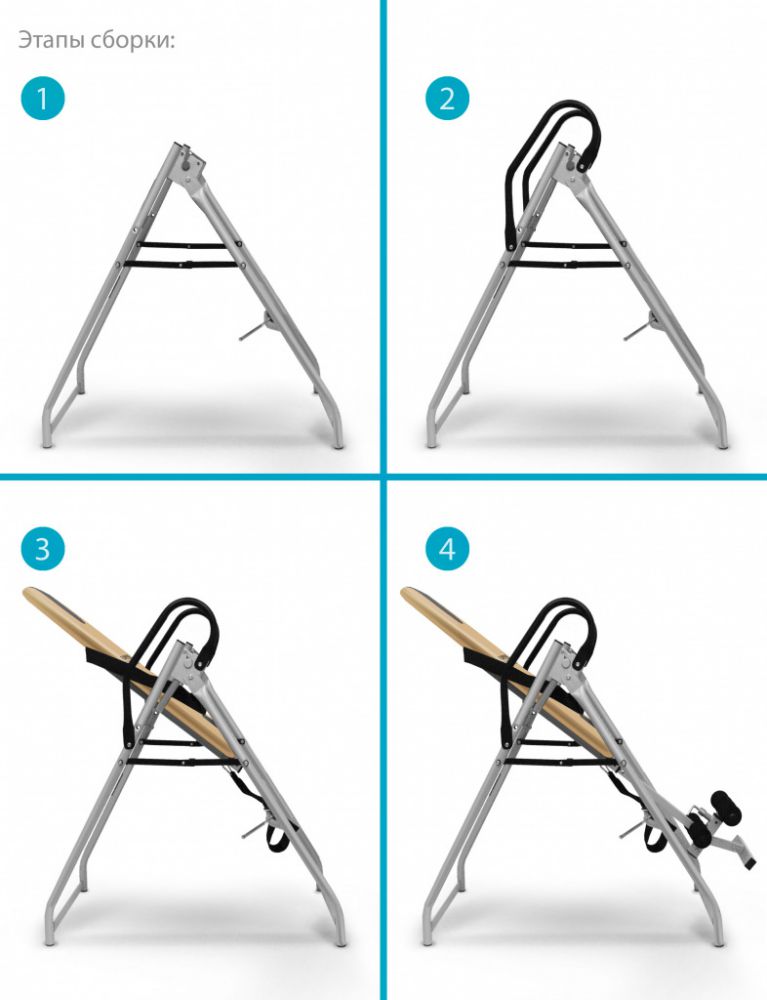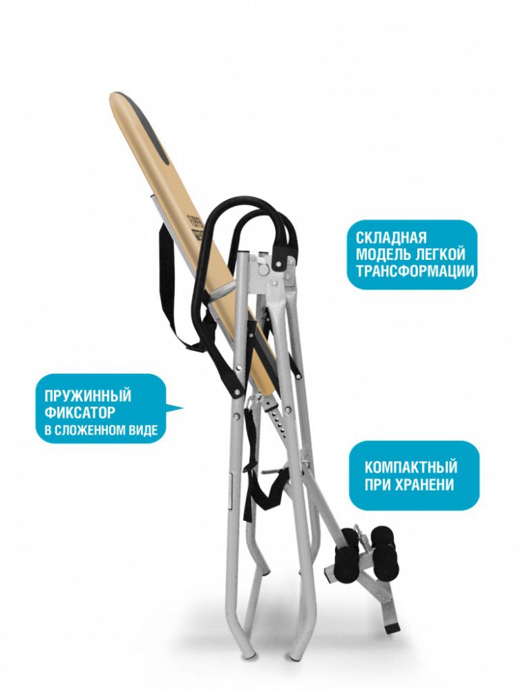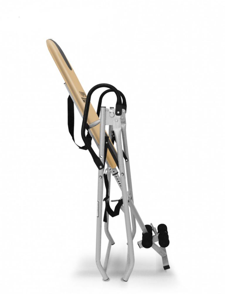 В сложенном виде тренажер компактен и занимает минимум места для хранения. В системе складывания предусмотрены втулки скольжения для более легкого складывания, а с помощью пружинного фиксатора можно зафиксировать инверсионный стол для хранения в сложенном виде.