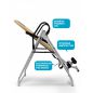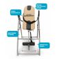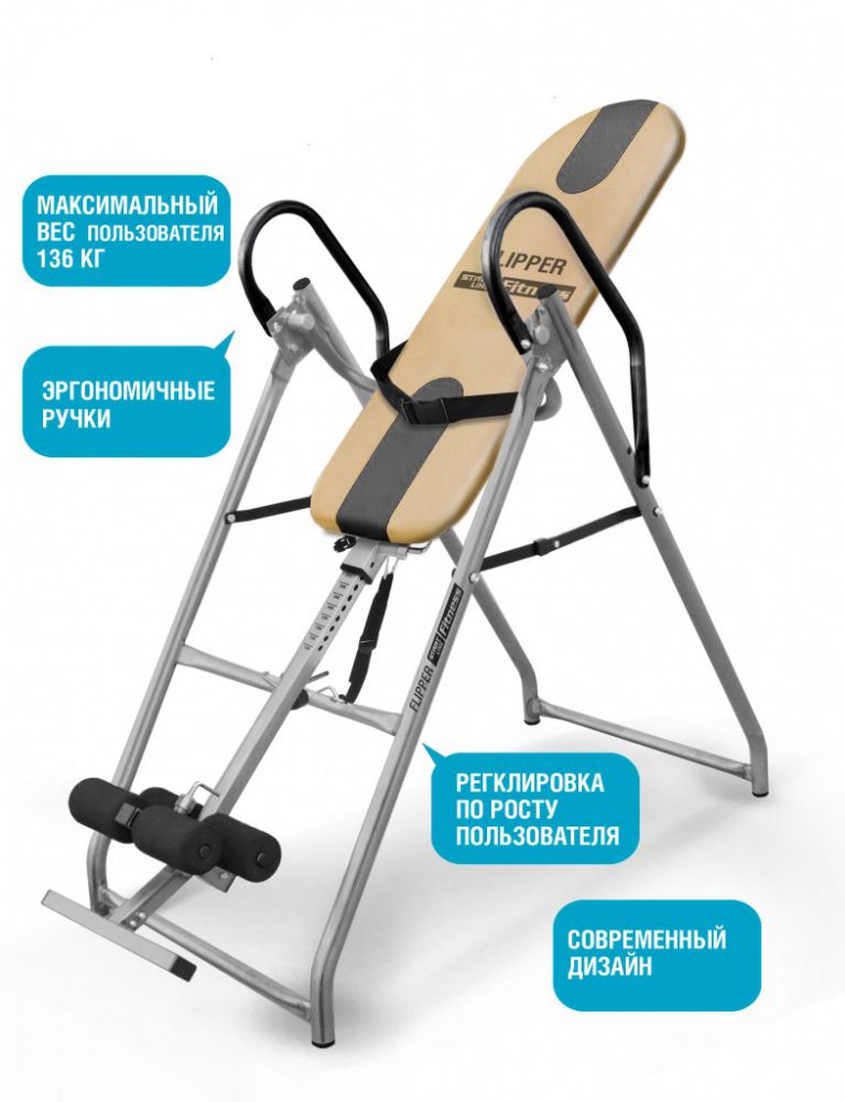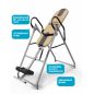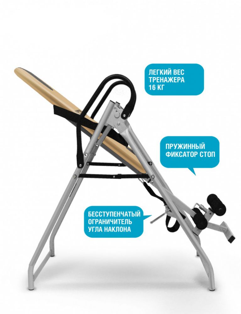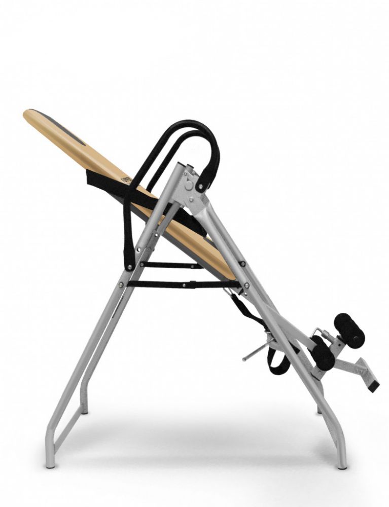 Стол имеет различные виды регулировки под рост пользователя от 150 до 197 см. Система бесступенчатого ограничителя угла наклона ремнем позволяет настроить оптимальный баланс для занятий. При резком возврате в исходное положение тренажера энергоемкий амортизатор поглощает удар об опорную часть. Система блокировки ног оснащена удобными мягкими валиками и имеет пружинный фиксатор стоп. Спинка стола оборудована ремнем для закрепления тренирующегося во время занятий. Инверсионный стол оборудован боковыми эргономичными ручками.