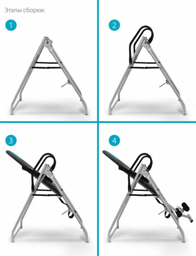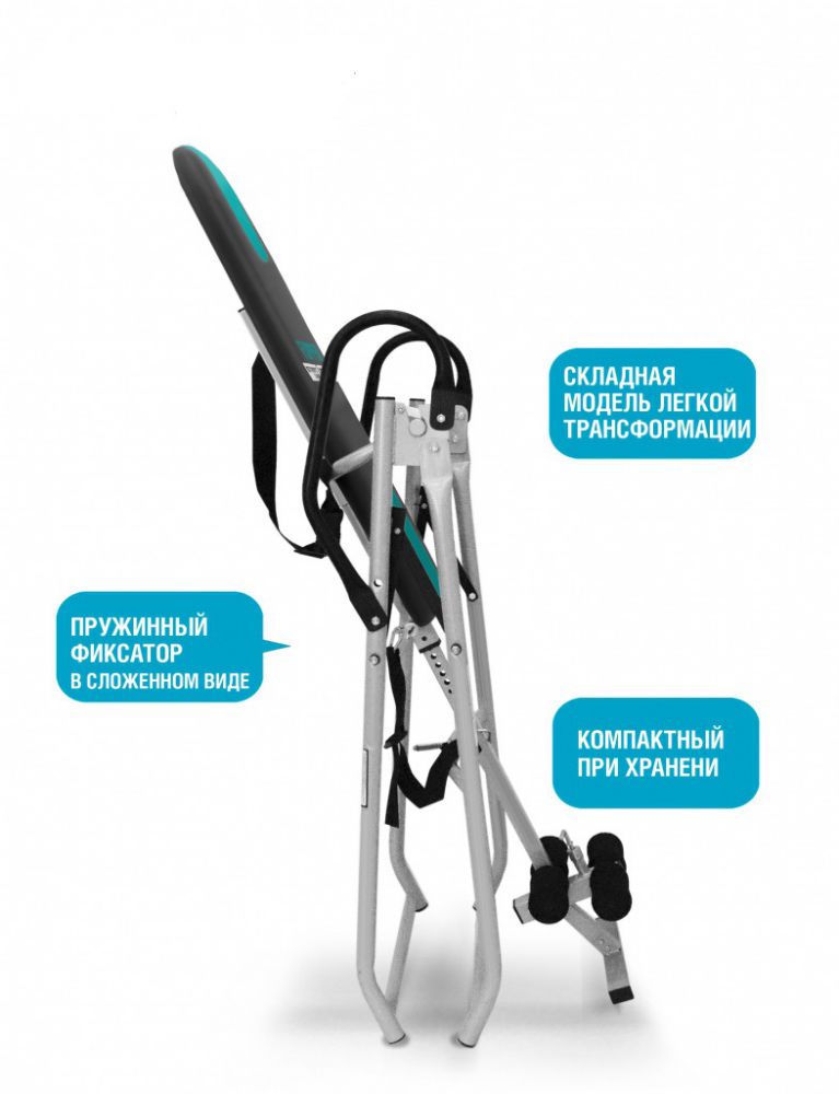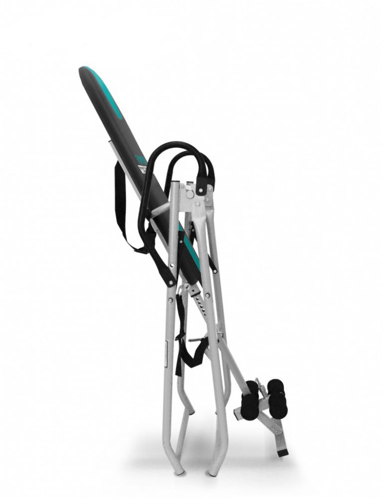 В сложенном виде тренажер компактен и занимает минимум места для хранения. В системе складывания предусмотрены втулки скольжения для более легкого складывания, а с помощью пружинного фиксатора можно зафиксировать инверсионный стол для хранения в сложенном виде.