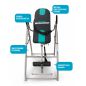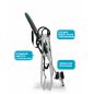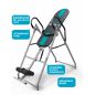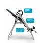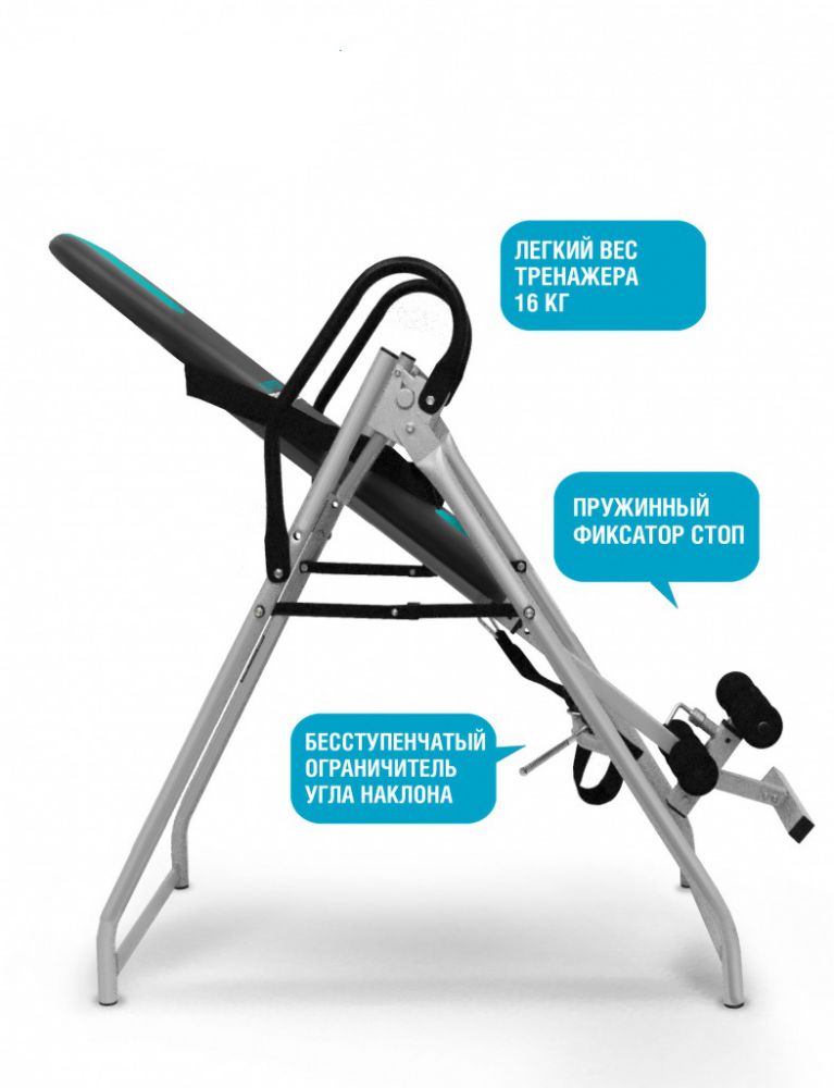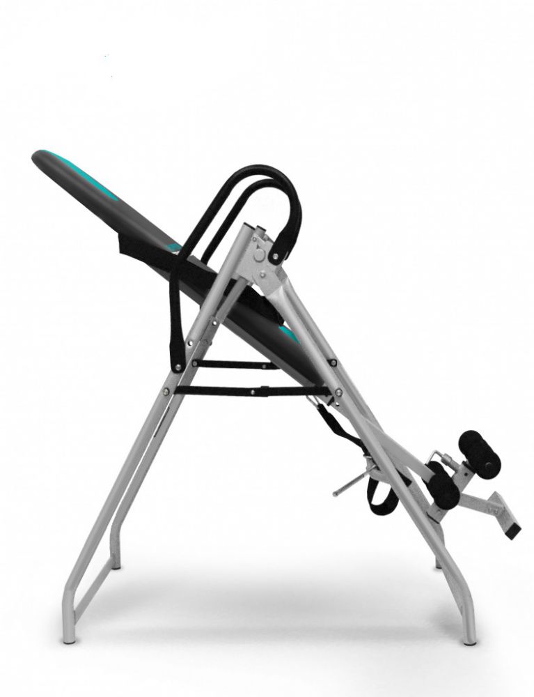 Стол имеет различные виды регулировки под рост пользователя от 150 до 197 см. Система бесступенчатого ограничителя угла наклона ремнем позволяет настроить оптимальный баланс для занятий. При резком возврате в исходное положение тренажера энергоемкий амортизатор поглощает удар об опорную часть. Система блокировки ног оснащена удобными мягкими валиками и имеет пружинный фиксатор стоп. Спинка стола оборудована ремнем для закрепления тренирующегося во время занятий. Инверсионный стол оборудован боковыми эргономичными ручками.