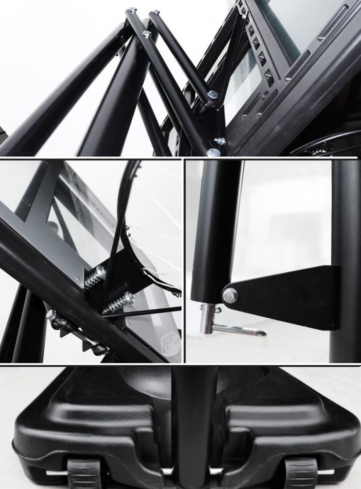 Корпус стойки устойчив, имеет прочное крепление щита, быстрый поворот и удобную регулировку по высоте. Щит изготовлен из современных полимерных материалов. Благодаря портативным колесам стойку легко передвигать.