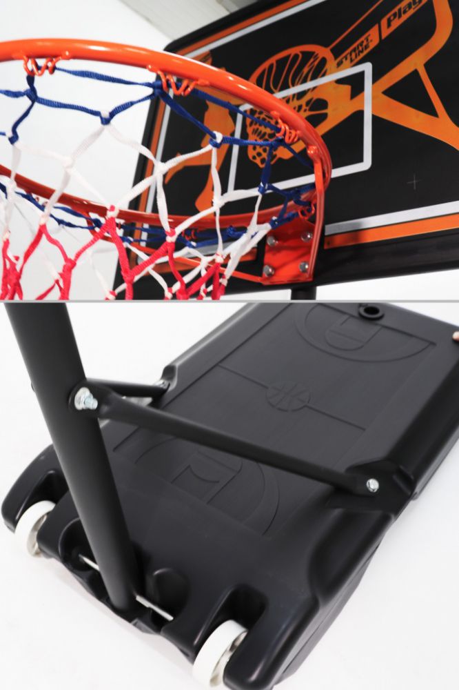 Щит изготовлен из современных полимерных материалов - высокопрочный усиленный пластик. Высота стойки регулируется в зависимости от роста игроков. Корпус максимально устойчив. Внешний вид баскетбольной стойки универсален, что позволяет установить его в любом экстерьере. Конструкция мобильна, основание обеспечено транспортировочными колесами.