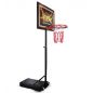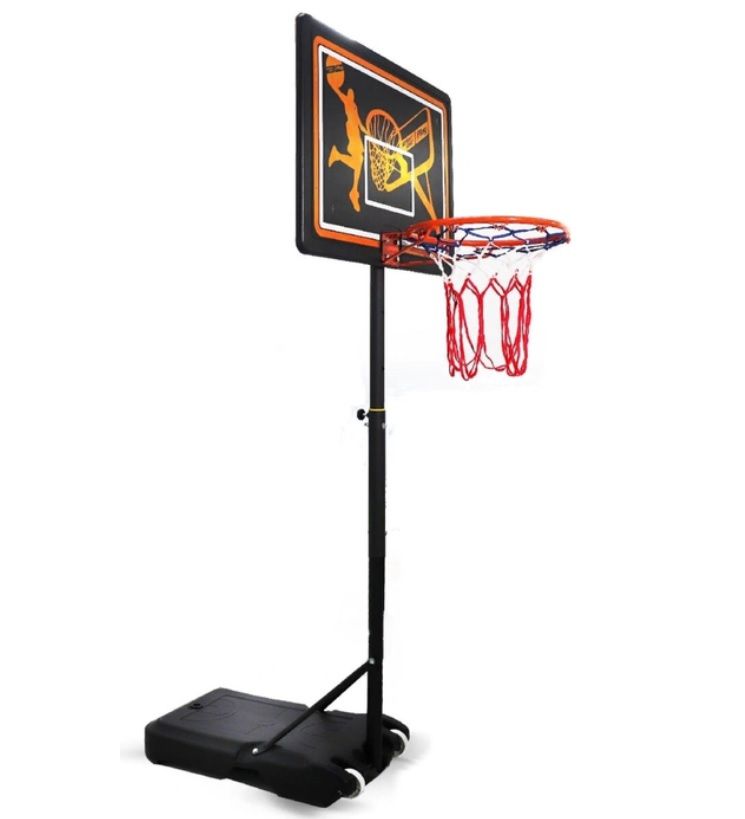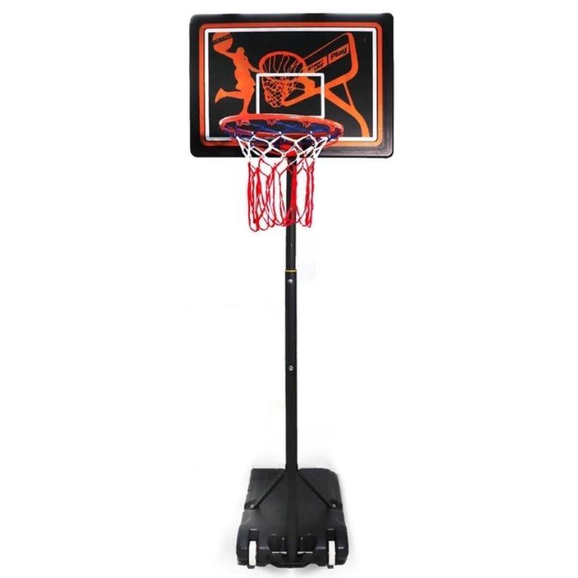 Мобильная баскетбольная стойка SLP Junior-018F с возвратным механизмом включает в себя полую базу, которая должна быть заполнена для утяжеления (рекомендуется песком), регулируемый по высоте щит и баскетбольную корзину.