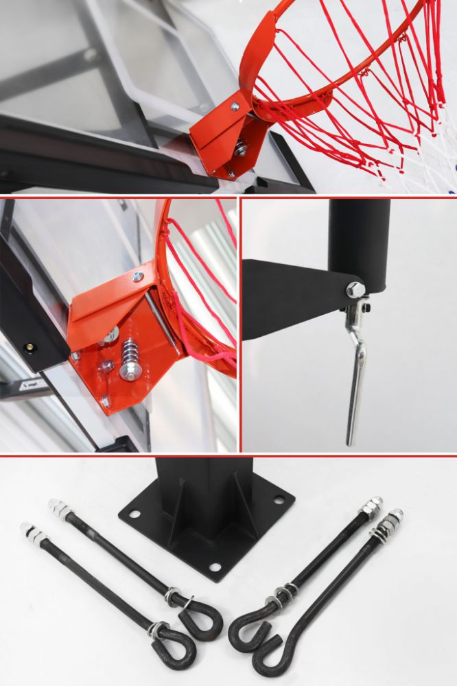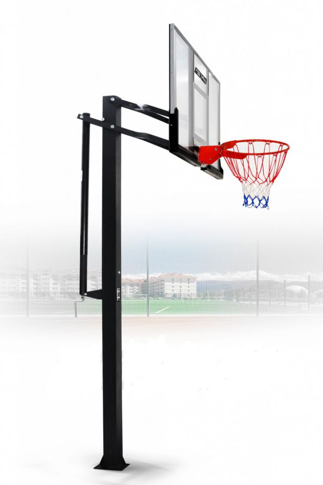 Баскетбольная стойка SLP Professional 022B для уличных площадок. Установка посредством бетонирования в землю. Щит изготовлен из ударостойкого поликарбоната, заключен в стальную раму-каркас, крепится к стойке специальным усиленным профилем. Стальное кольцо и нейлоновая сетка поставляются в комплекте.