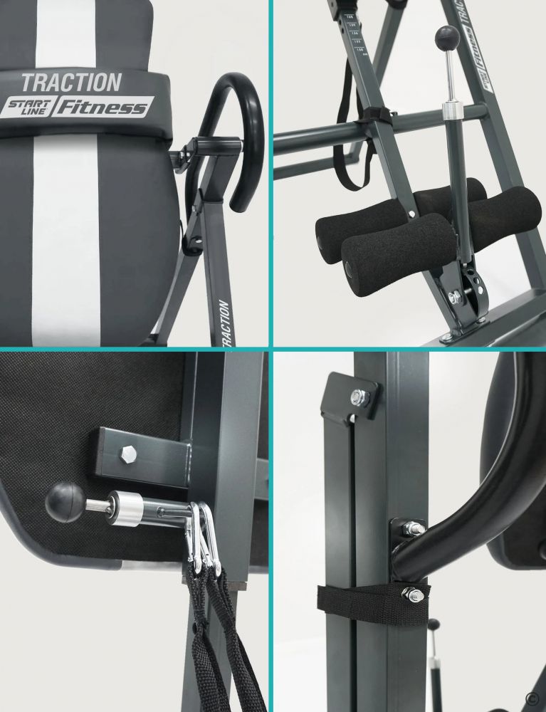 Заниматься инверсионной терапией на столе Traction могут как подростки, так и взрослые, ведь уровень роста регулируется от 150 до 197 см. Ограничение угла наклона осуществляется с помощью двух ремней, позволяющих выставить оптимальный угол для тренировки. При возврате в исходное положение энергоемкий амортизатор поглощает удар об опорную часть.