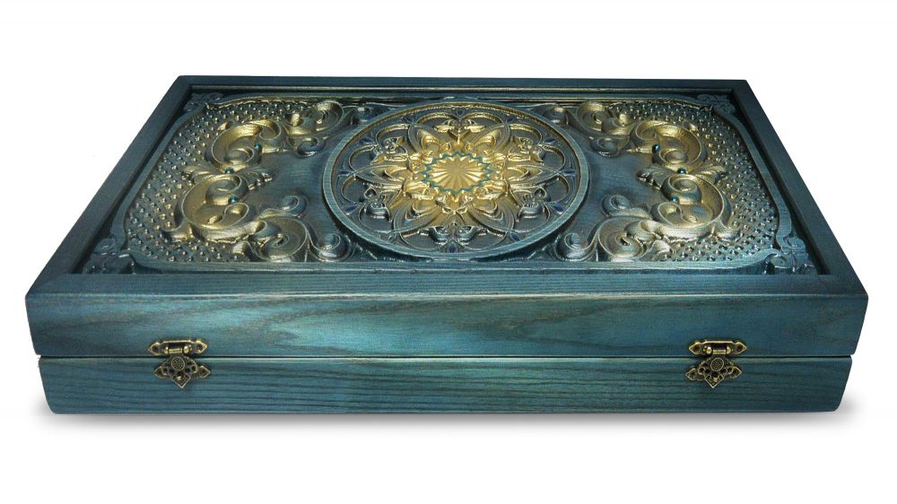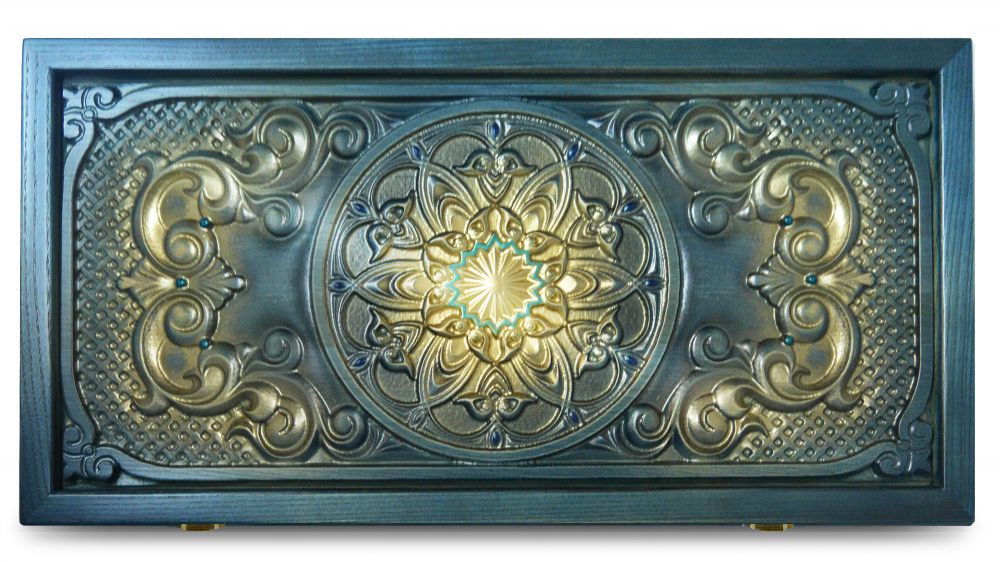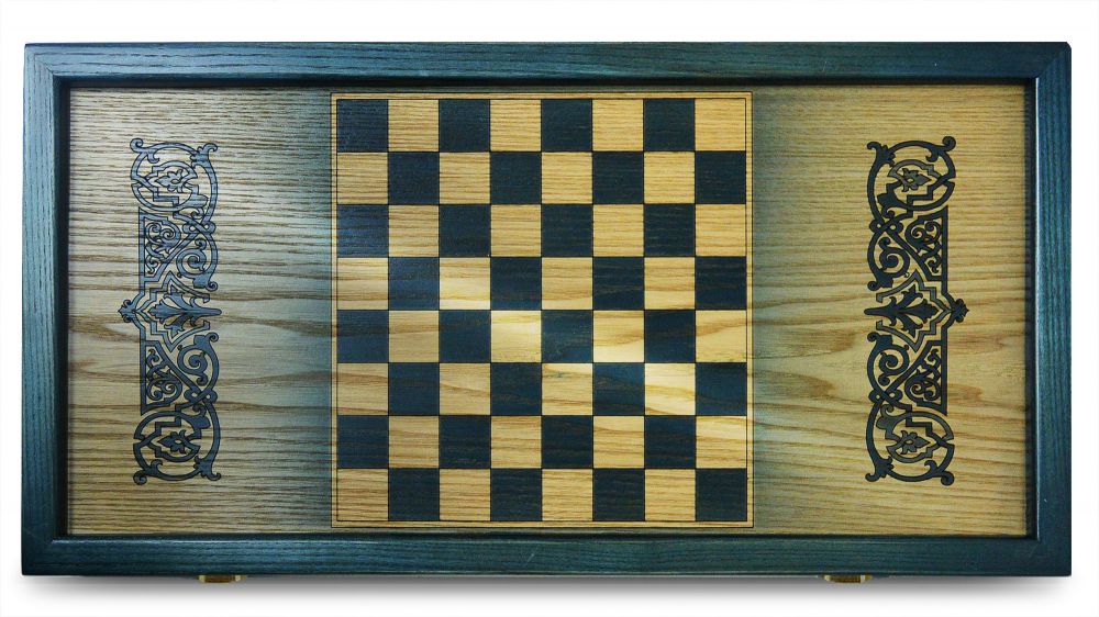 Нарды - шашки "Восток" - модель, предназначенная для настоящих ценителей не только нард, но и дорогих элитных вещей. Материал изготоления - массив ясеня. Крышка украшена орнаментом, сделанным вручную. Резные элементы придают особый шарм. Короб имеет позолоченную фурнитуру, фишки помещаются в отдельный ложемент. Особенность данной модели в том, что она совмещает в себе две игры - нарды и шашки.