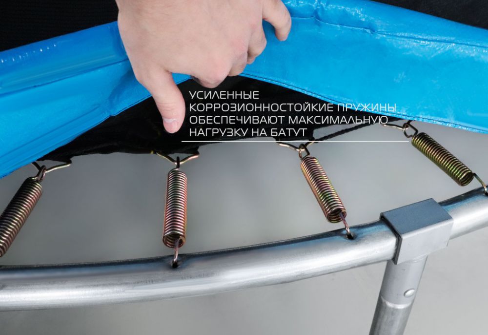 Поверхность для прыжков выполнена из самого прочного полипропилена последнего поколения "Перматрон". Пружины из высококачественной стали, имеют повышенную защиту от износа и растягивания. Для обеспечения безопасности пружины закрыты защитным чехлом.