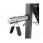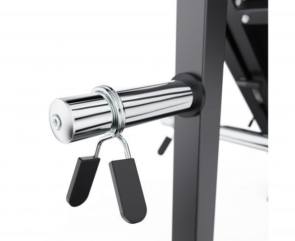 Максимальная нагрузка на узел подвешивания весовых дисков составляет 150 кг, а для хранения дисков — 75 кг. Для удобства и безопасности во время занятий установлен пружинный зажим, который надежно фиксирует диски на грифе, предотвращая их смещение. Такая конструкция обеспечивает стабильность и безопасность при тренировках с большими весами.