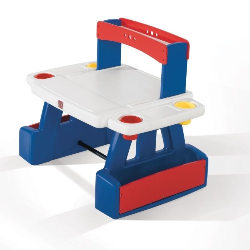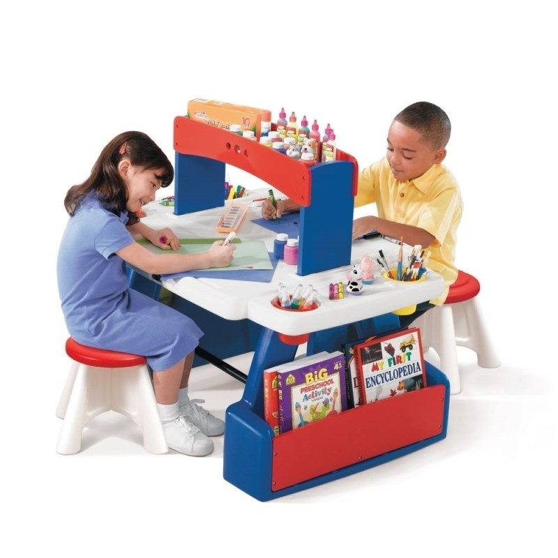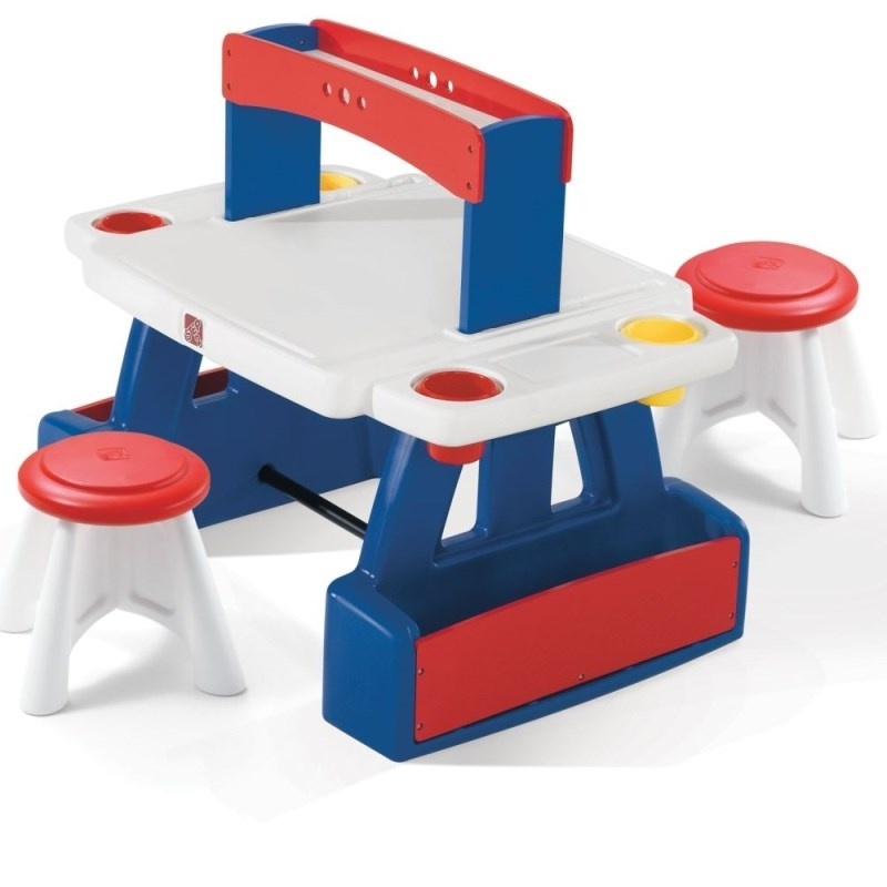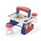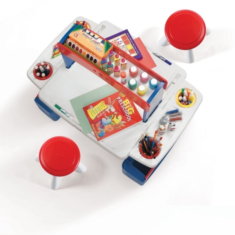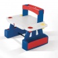 Парта Дуэт позволяет одновременно заниматься рисованием и творчеством сразу двум детям. Благодаря тщательно продуманной конструкции, дети смогут удобно разместить свои канцелярские принадлежности на рабочей поверхности, а также абсолютно не будут мешать друг другу. Помимо самой парты в комплекте с ней вы найдете 2 табурета. Комплект изготовлен из ярких деталей синего, красного и белого цветов, которые обязательно впишутся в любой интерьер. Устойчивость как парте, так и табуретам придает наличие широких ножек. Парта оснащена большой столешницей, которую при необходимости могут делить два ребенка, сидя друг напротив друга. В ней присутствуют специальные выемки и посадочные места для стаканчиков, чтобы детям было легко и удобно хранить свои канцелярские товары. Для книг и прочих принадлежностей имеется специальная полка. Также парта оборудована и боковыми карманами. Благодаря закругленным углам, данный комплект детской мебели не является травмоопасным. Для размещения ног в процессе занятий за столом предусмотрено наличие подставки. Чтобы превратить парту из стола для одного ребенка в стол для двух, необходимо выполнить простую трансформацию. Поверхность стола легко моется, поэтому не доставит никаких хлопот в содержании ее в чистоте. Набор изготовлен из ударопрочного пластика, отвечающего современным стандартам качества и экологичности. Его легко мыть и чистить.