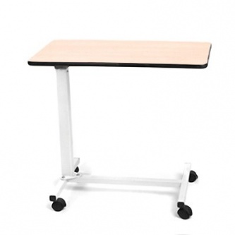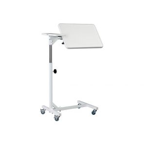 Столешница изготовлена из прочной пластмассы, устойчивой к местному нагреву и санитарной обработке. Ножки столика оснащены колесиками. Для фиксации стола в неподвижном положении на задних колесах расположены тормоза.
