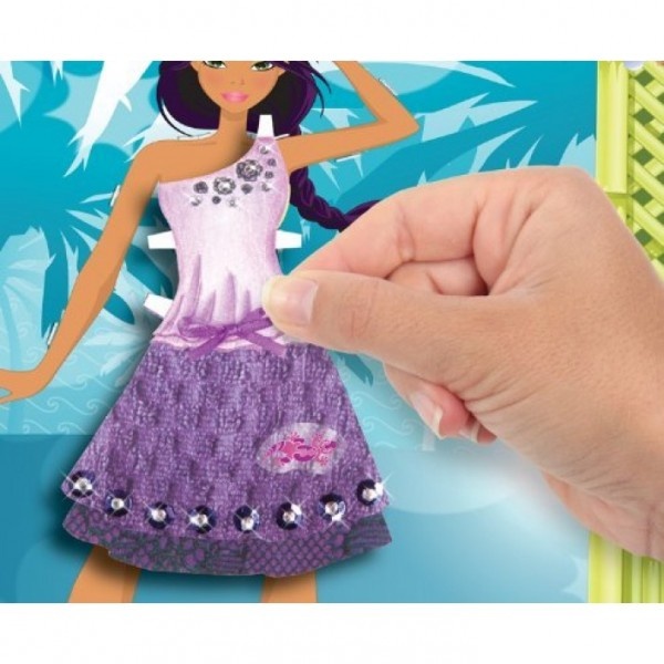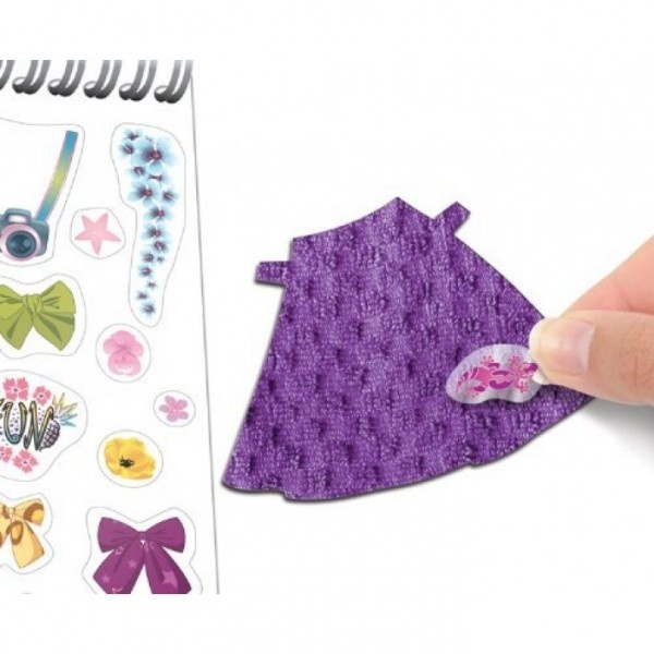 В комплекте: - 1 платье-основа, шкафчик для вещей на страничке; - 4 трафарета; - 4 иллюстрированных листа с идеями; - 150 стикеров; - 10 страниц шаблона; - 40 нарядов; - пайетки, стразы и ленточки; - клей с блестками; - 6 цветных карандашей; - иллюстрированные инструкции.