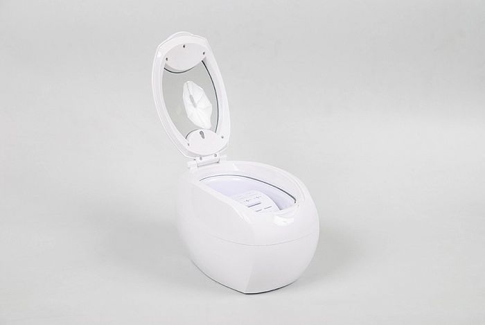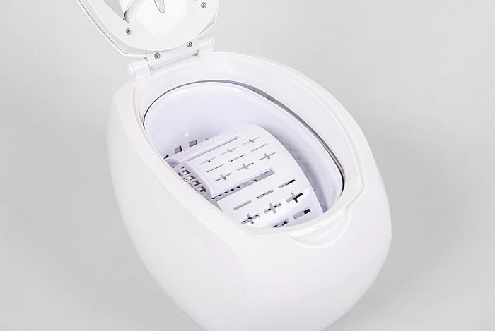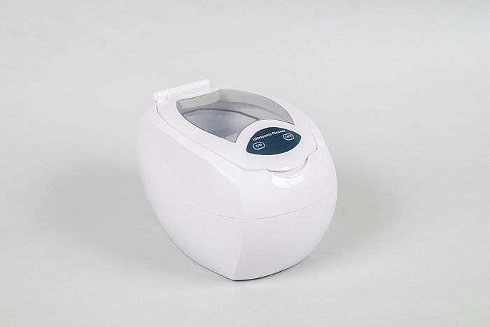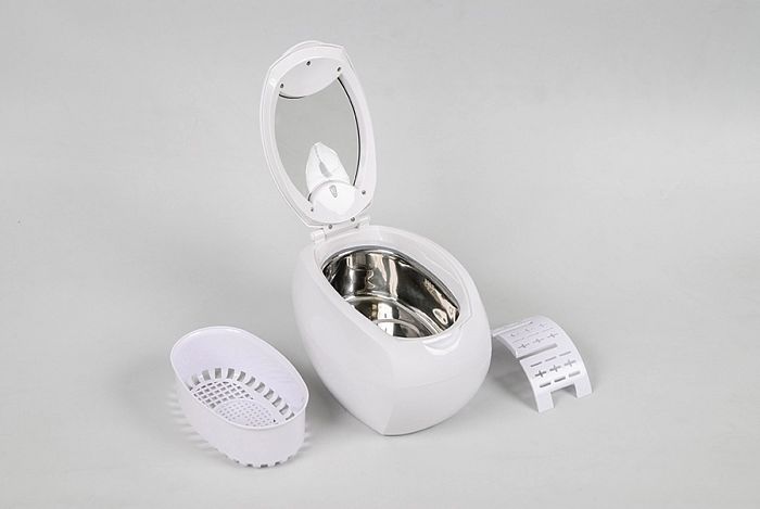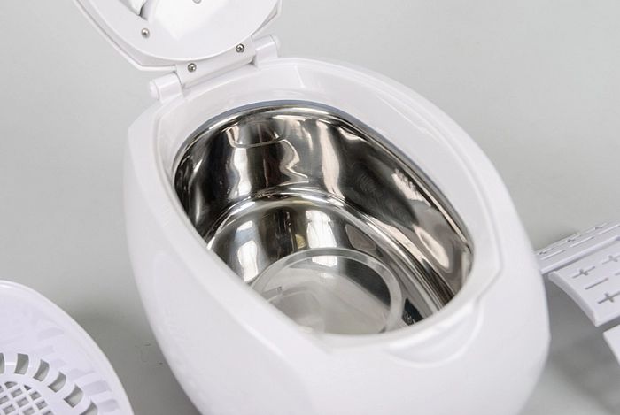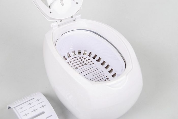Практически бесшумный режим работы. Аналоговое управление. Смотровое окошко на крышке, позволяющее полностью контролировать процесс очистки. Объём ёмкости из нержавеющей стали 600 мл. Прибор оборудован встроенным таймером.