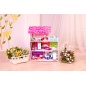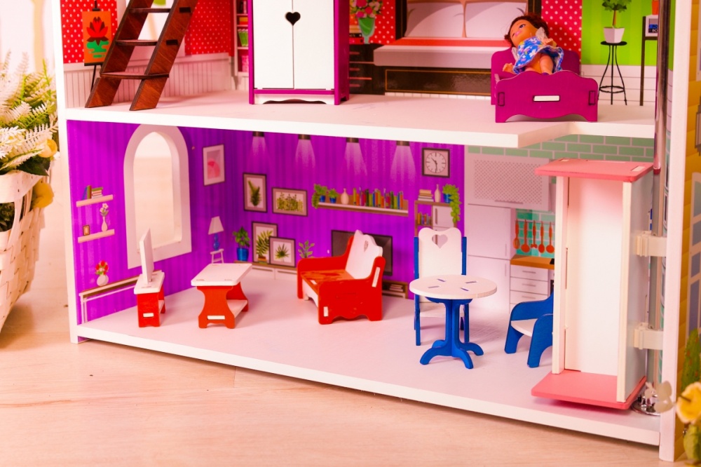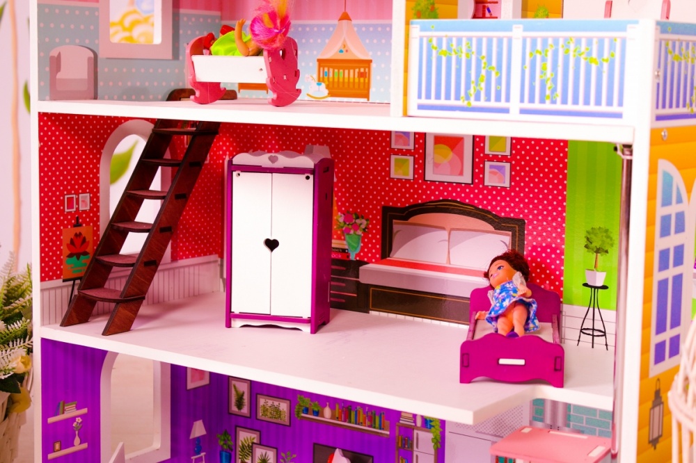 Хотите подарить ребенку увлекательный игровой досуг? Тогда кукольный домик SunnyToy Усадьба мини станет незабываемым подарком! Домик трехэтажный, первый этаж – объединённый кухня и зал. С первого на второй этаж идет лифт, на втором этаже расположена спальня. Игрушка выполнена из качественных материалов и обеспечивает простоту ухода – домик можно протирать влажной тряпочкой. Из мебели в домике есть шифоньер и кровать. На третий этаж и едет лестница, там расположена детская комната с мебелью - трюмо, кресло качалка и детская кроватка. Мебель выполнена из березовой фанеры, покрашена акриловыми красками. Стенки домика покрыты пленкой - это защитит его от мелких царапин и повреждений.