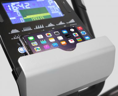 Тренажер имеет в своем арсенале мощный тренировочный компьютер. Консоль нацелена на достижение спортивных задач, как любителей, так и опытных пользователей. Цветной дисплей на основе жидких кристаллов отображает все ключевые показатели. За считывание данных пульса отвечают вмонтированные в рукоятки сенсорные датчики. Монотонную тренировку разнообразит такое приятное дополнение, как подставка под гаджеты. Его легко можно переместить в другое место при помощи двух транспортировочных роликов. Устойчивость тренажера на неровной поверхности гарантируют компенсаторы неровностей пола.
