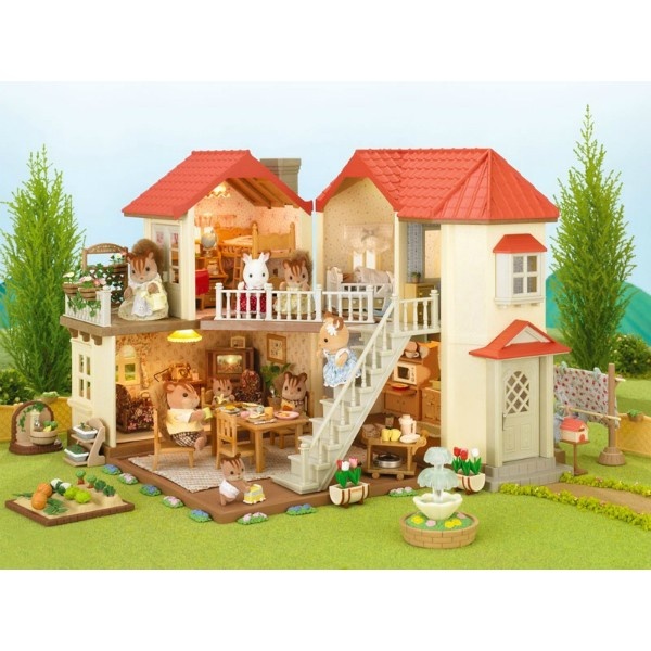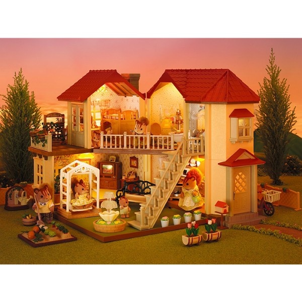 Игровой набор Sylvanian Families представляет собой разборной дом, совмещенный с площадкой и приставными лестницами. Домик выполнен из высококачественных материалов, украшен декоративными элементами. Главной особенность данной модели является наличие освещения на каждом этаже дома. Маленькие светильники и лампы освещают комнаты и лестничные пролеты дома. С внутренней стороны дома комнаты открыты, обеспечивая ребенку свободный доступ ко всем этажам и окнам комнат. Большой балкон украшают резные ограждения. Дом готов к заселению различными героями и станет любым местом игры детей.