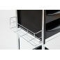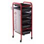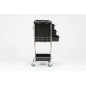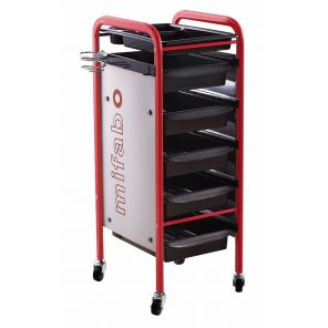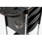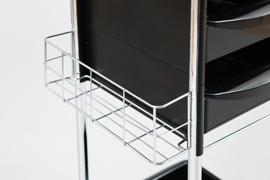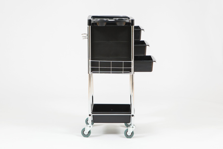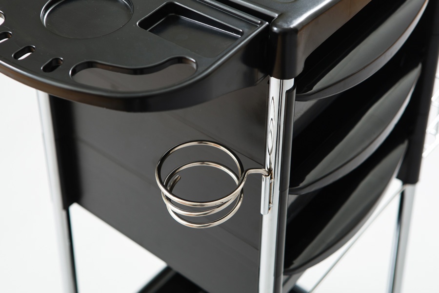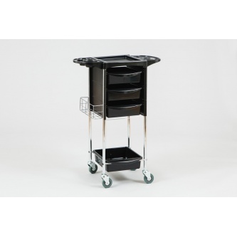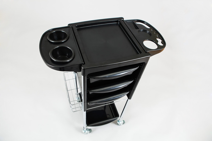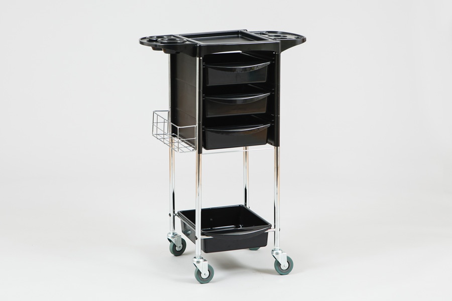 Тележка парикмахерская на колесах, с тремя выдвижными ящиками, одной нижней полкой и двумя дополнительными панелями с отверстиями для чаш и брашеров, фенодержатель.