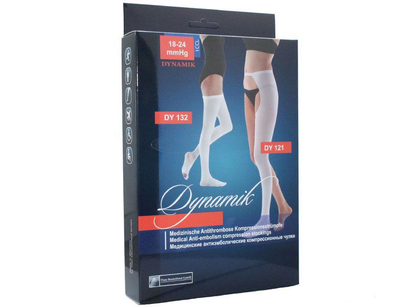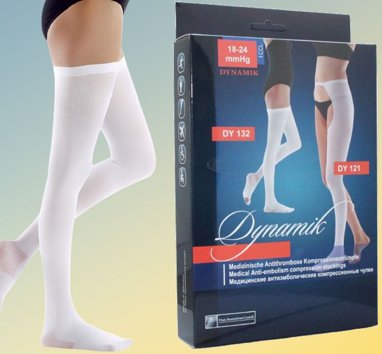 Чулки компрессионные антиэмболические противоварикозные "DYNAMIK" DY132 эффективны для профилактике тромбоза глубоких вен, улучшают кровоток при венозных нарушениях, такие как хронических венозных застоях.