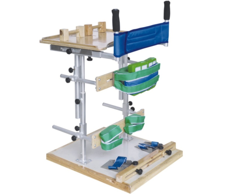 Специальные крепления удерживают пациента в стоячем положении. Наличие специальных регулировок дает возможность подогнать устройство точно под размеры ребенка и обеспечить максимальную безопасность процедур. В комплектацию вертикализатора входит специальный столик для занятий и еды.