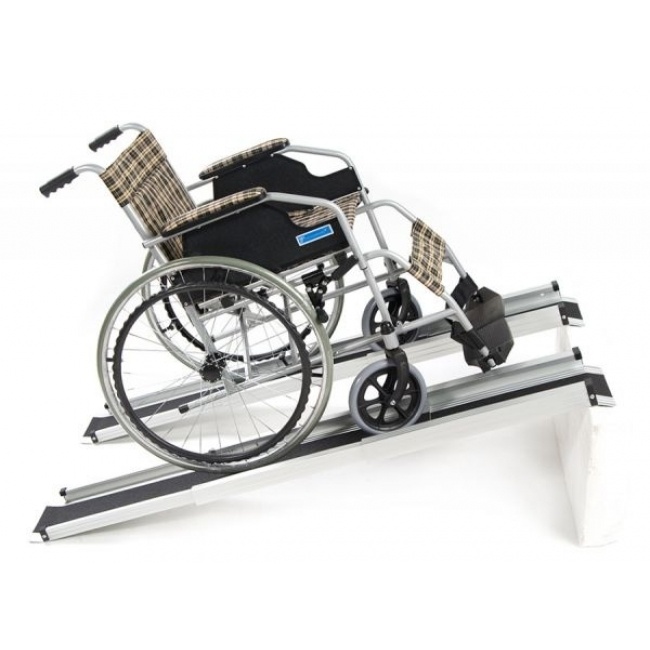 Пандус телескопический 2-х секционный LY-6105-2-150 для инвалидных колясок. Длина пандуса 150 см. Угол наклона не должен превышать 12°. Пандусы (с двумя профилями) не используются для электрических колясок и скутеров.
