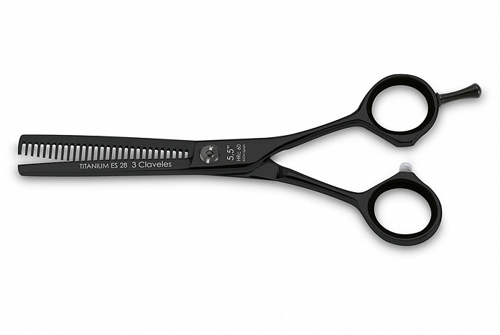 Ножницы филировочные Titanium ES 12497 от испанского бренда 3Claveles изготовлены из качественной нержавеющей стали и имеют покрытие из нитрида титана, которое гарантирует повышенную износоустойчивость. Одна филировочная кромка с 28 зубцами, классическая форма, съёмный упор для мизинца, обеспечивающий баланс во время работы с инструментом, регулируемый винт натяжения полотен – всё это в сочетании с безукоризненным сдержанным дизайном делает эти ножницы идеальными для филировки волос любого типа.