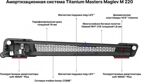 Беговая дорожка Maglev M220 – новейшая разработка от Titanium с уникальной системой амортизации. Амортизация Titanium Masters Maglev M220 является сложнейшей и наиболее технологичной системой среди домашних беговых дорожек на сегодняшний день. Она включает в себя комбинацию из магнитной подушки mag-LEV™, сотовой амортизации honey-COMB™, полноразмерных динамических эластомеров VCS™ Colonne и полиуретановых амортизаторов soft-WAVE™ Plus.