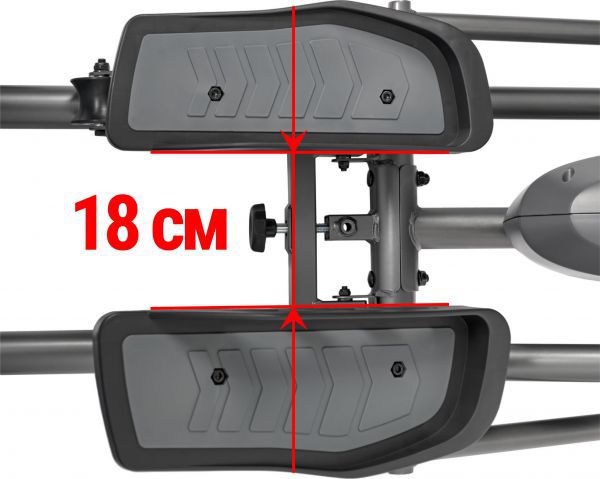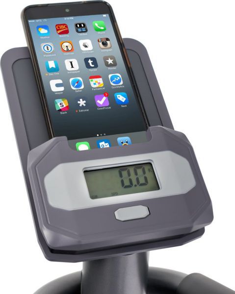 Тренировочный компьютер представлен черно-белым LCD-дисплеем с удобной подставкой под смартфон или планшет. Измерение пульса происходит путем удержания ладоней на сенсорных датчиках пульса, расположенных на поручнях. Нагрузка регулируется механическим путем в 8 положениях.