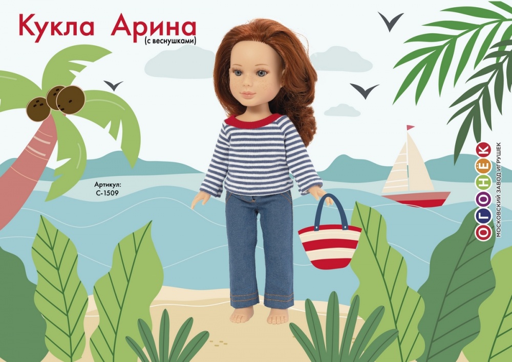 Кукла Арина С-1509 имеет необычную красивую внешность - у нее веснушки и густые рыжие волосы. Одета она в удобный полосатый джемпер и стильные джинсы. Кукла Арина - современная девушка. Увлекается модой и живописью, любит смотреть кино и путешествовать. Эта очаровательная кукла может стать настоящей подружкой для ребёнка. Небольшой рост куклы позволяет брать её с собой в путешествия.