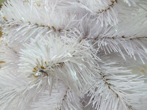 Ель имеет белый цвет хвои, создающий иллюзию заснеженности. Такая расцветка очень освежает и выгодно смотрится. Сборка ели осуществляется по специальным цветным маркерам, которым отмечены места крепления и сами детали. Высота ели с мешочком составляет 45 см.