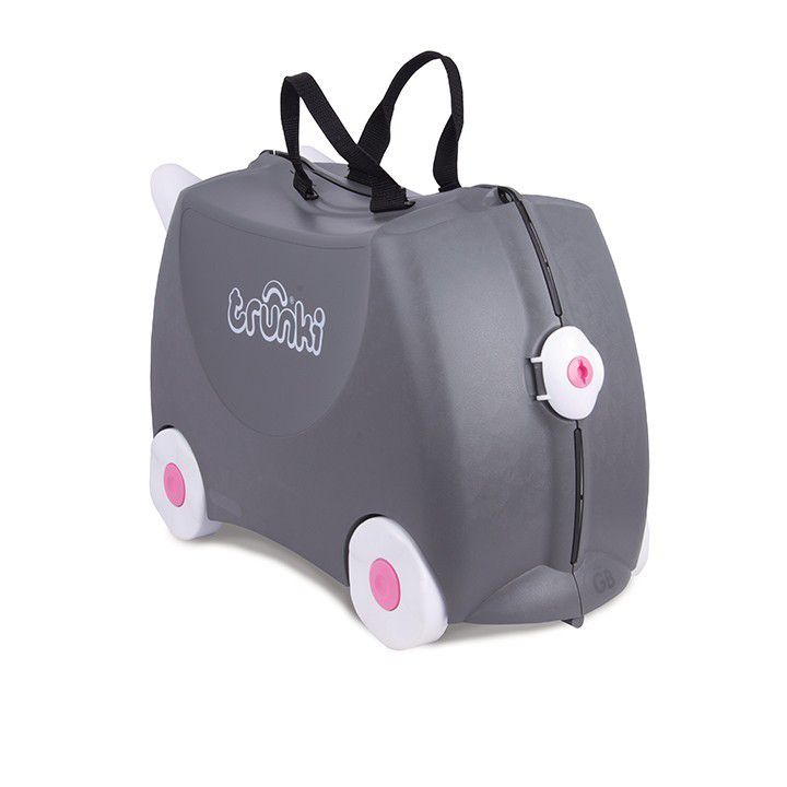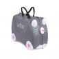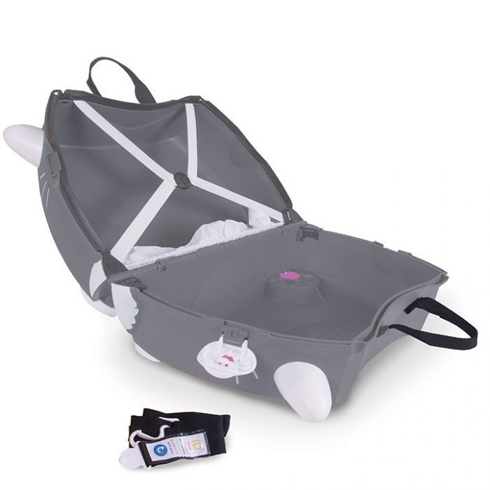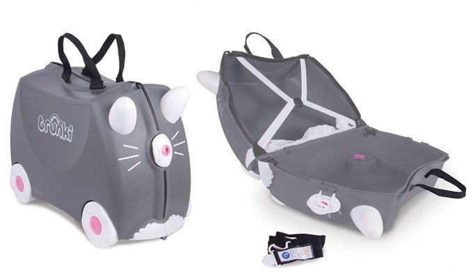 Замечательный детский чемодан на колесиках непременно понравится деткам, благодаря оригинальному дизайну – он стилизован под серого котика с белыми лапками и ушками, за которые можно держаться. Изделие имеет прочный пластиковый корпус, вверху сиденье для ребенка, на котором он сможет отдохнуть.