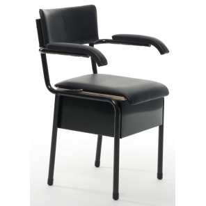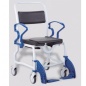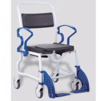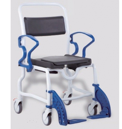 Совмещает в себе полноценное туалетное устройство и сидение для приема душа. Металлические части конструкции не подвержены коррозии и ржавчине. Безопасность достигается за счет закругленных краев стула и стояночных тормозов, расположенных на задних колесах. Устройство оснащено пластиковыми вращающимися подножками.