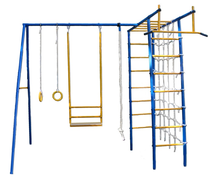 Единственный недостаток – допустимая нагрузка не должна превышать 100 кг, что ограничивает количество детей, которые могут одновременно пользоваться комплексом. Уличный комплекс Active Game предназначен для проведения активного досуга детей. Установка комплекса осуществляется в специально отведенных зонах, спортивных площадках, парках или даче. Комплекс богат снаряжением, предусмотрены различные элементы, позволяющие задействовать в игре всех членов семьи и друзей. Основу комплекса составляют шведская стенка и металлическая опора, между которыми расположены одноместные качели. Возле качели находятся подвесные кольца с прорезиненными рукоятками. Качели оснащены спинкой, обеспечивающей безопасность ребенка. У шведской стенке примыкает турник, канатный лаз, канат.