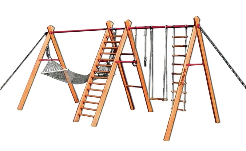 Комплекс Sunny Day — многофункциональное спортивное оборудование, созданное для активных занятий, отдыха и времяпровождения детей и подростков. Комплекс устанавливается на улице, в специализированных зонах, детских площадках. Деревянный каркас отличается экологичностью, безопасностью и продолжительным сроком эксплуатации. Защитное покрытие оберегает элементы конструкции от влаги и вредных внешних воздействий. Комплекс представлен двумя опорными стойками, лестницей, подвесными кольцами, качелями и гамаком.