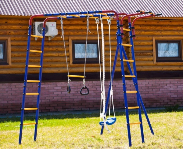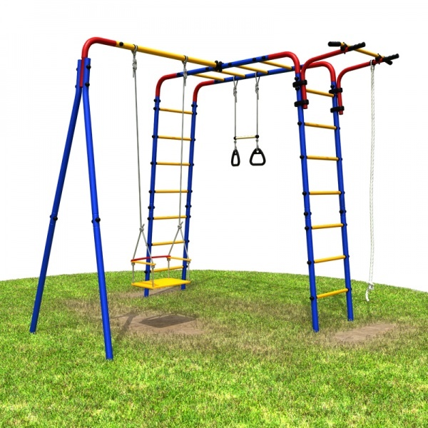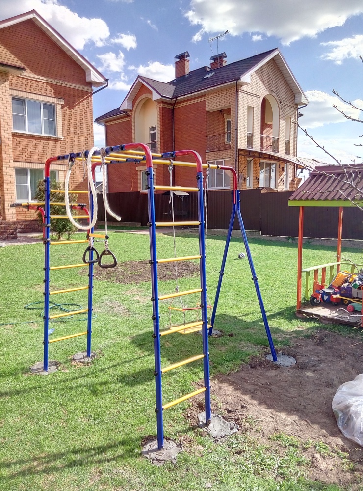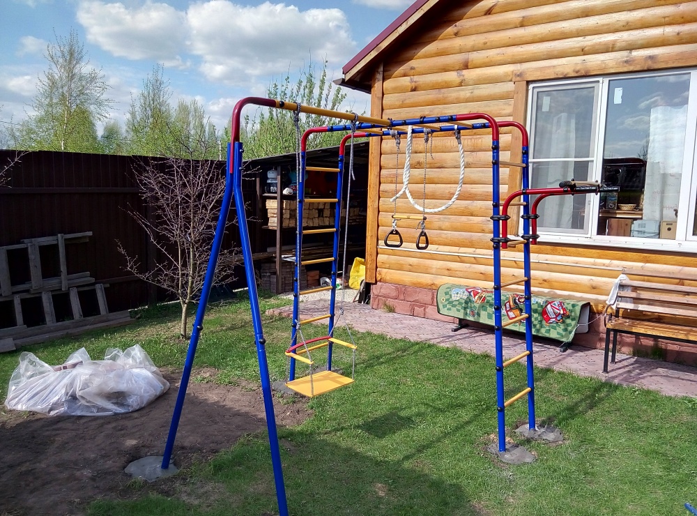 Достоинства: Богатая комплектация — канат, качели, турник, кольца с перекладной, лазелки Минусы: Установка (цементирование основания конструкции), Отсутствие спинки у качелей Когда привезли комплект в двух коробочках, то я мягко говоря напрягся и первая мысль «и это все???» Но когда я собрал конструкцию, то моя душенька успокоилась! Все детальки были компактно упакованы, в сопровождении была понятная инструкция на русском языке. Детали из прочного сплава, покрыты эмалью, которые пережили влажную осень, морозную зиму и не поржавели, не облезли.