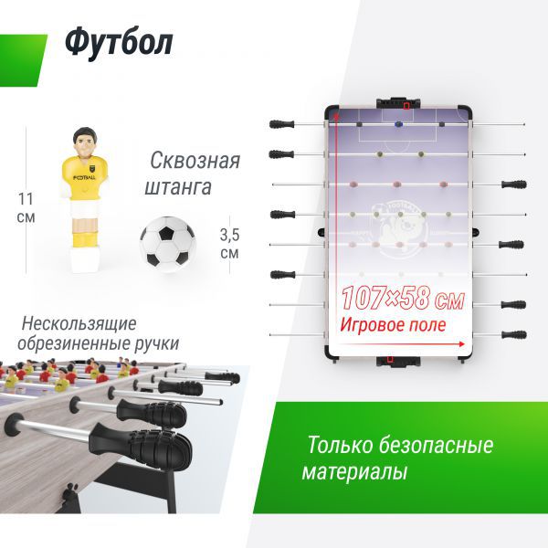 Одно из полей – поле для настольного футбола. Знаменитой и любимой игрой многими детьми и взрослыми. Кикер оснащен плавными и точными игровыми фигурками, которые позволяют вам контролировать мяч и создавать захватывающие комбинации. Высота игроков 11 см, мяч 3,5 см. Все фигурки изготовлены из пластика.